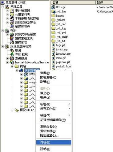 2.Internet Information Services=>網站=>預設的網站 點滑鼠右鍵=>內容