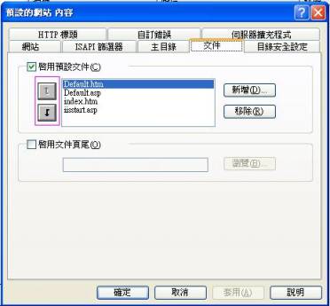 原本defult再的地方就是別人連到你ip時所聯結的網頁,利用框框 框起來的方向鍵 可以調整順序,利用右方的新增移除鍵可以 加入 或是 移除 網頁